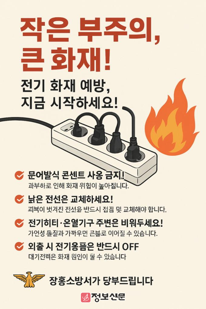 장흥소방서 관계자는 “전기 화재는 대부분 사소한 부주의에서 비롯되며, 올바른 사용 수칙을 지키는 것만으로도 충분히 예방할 수 있다”며, “군민 여러분의 적극적인 관심과 실천을 당부드린다”고 전했다.
