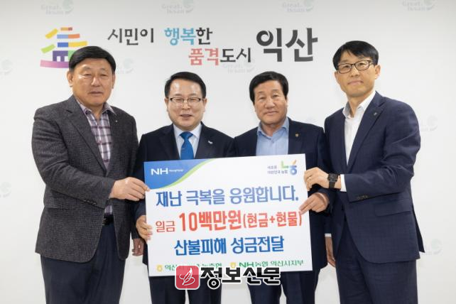이날 기탁된 성금은 산불 피해로 힘든 시간을 보내고 있는 이들에게 조금이나마 위로를 전하기 위해 농협 익산시지부 직원들의 자발적인 모금 활동을 통해 마련됐다. 성금과 쌀은 피해 복구 등에 사용될 예정이다.