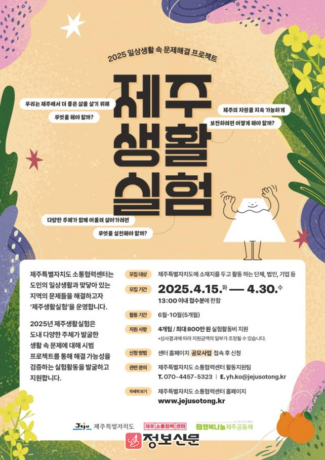 ![]() 제주특별자치도 소통협력센터, 2025제주생활실험 참여단체 모집 |