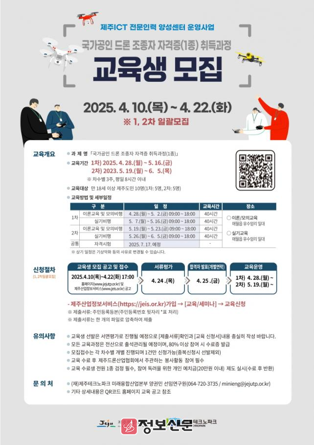 ![]() 제주테크노파크, 국가공인 드론조종자 1종 자격증 교육생 모집 |