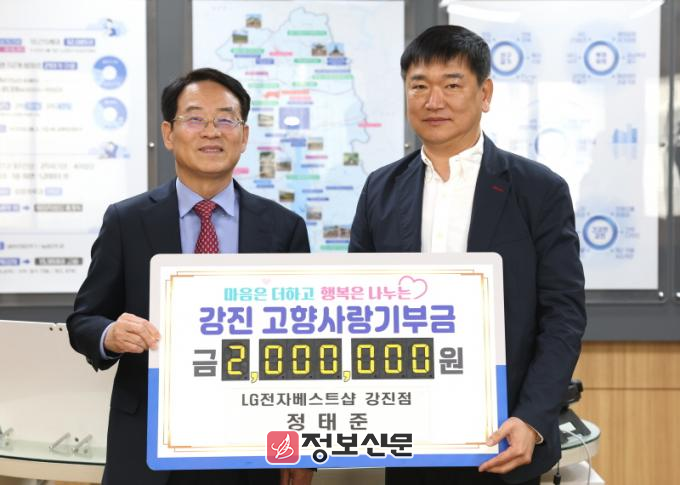 2024년 강진군민 장학금 3백만 원을 기탁한 LG전자베스트샵 강진점 정종훈 대표는 이번 기탁식에서 아들 정태준씨의 이름으로 대리 기탁해 “우리 강진이 더 살기 좋은 지역이 되길 희망한다”며 “어려운 시기에 주민 모두가 힘내시길 바란다”고 말했다.
