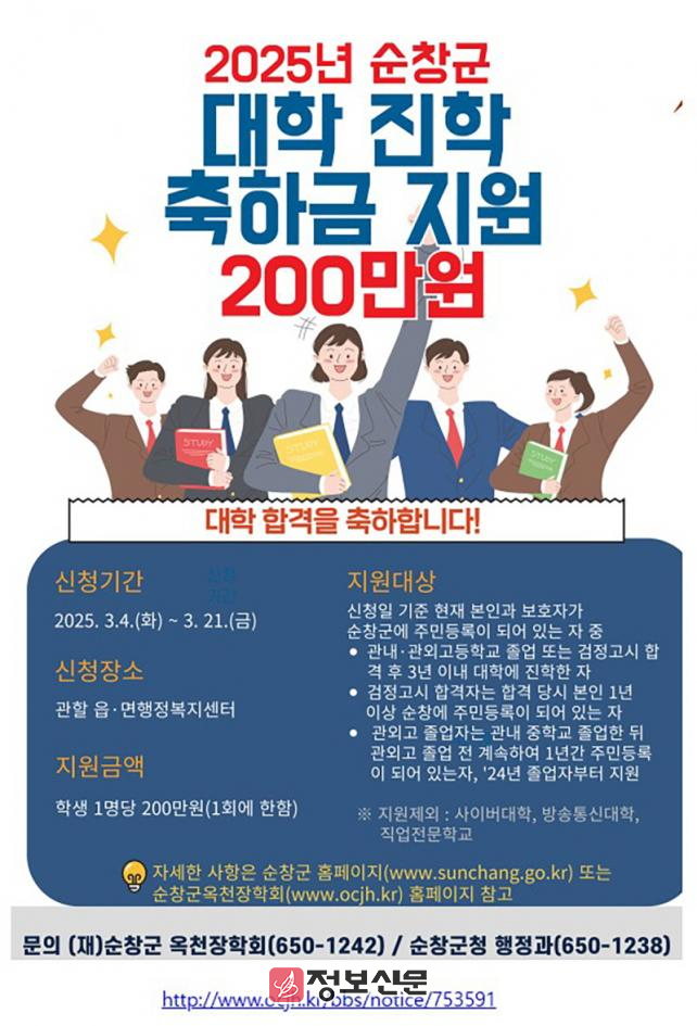 ‘대학 진학 축하금 지원사업’은 순창군이 장학회에 사업비를 출연해 추진하는 사업으로, 학부모의 경제적 부담을 덜고 대학 신입생의 초기 생활 안정을 돕기 위한 취지로 마련됐다.