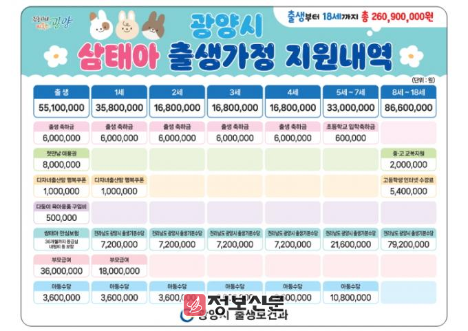 아울러, 향후 해당 가정에는 삼태아 3인 기준으로 출생축하금 3,000만 원, 첫만남이용권 800만 원, 다자녀 출산맘 행복쿠폰 200만 원, 다둥이 육아용품 구입비 50만 원, 전라남도·광양시 출생기본 수당 1억2,960만 원, 부모 급여 5,400만 원, 아동수당 2,880만 원 등 총 25,300만 원이 지원될 예정이다.