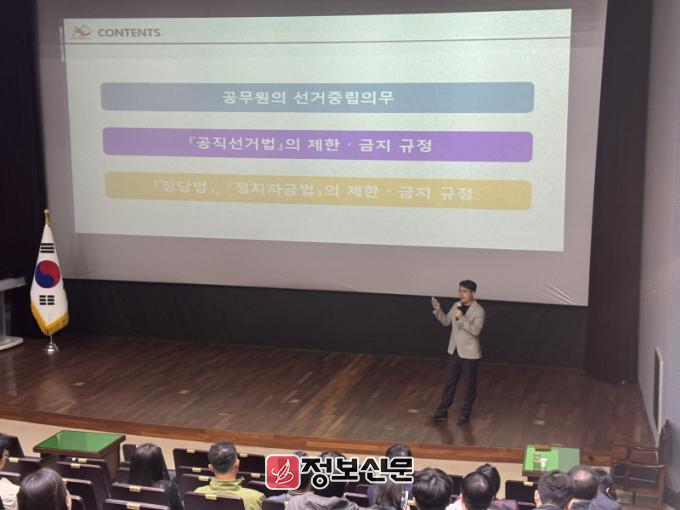 박회관 사무과장은 강의에서 “공직자의 정치적 중립 의무는 민주주의의 공정성과 신뢰를 지키기 위한 핵심 요소”라며 “특히 선거 시기에는 사적인 모임, SNS 활동 등 모든 상황에서 중립성 유지를 철저히 해야 한다”고 강조했다. 이어 공무원이 평소 업무 중이나 사적 모임, SNS 활동 등 일상적인 상황에서도 정치적 중립을 지켜야 한다는 점을 사례 중심으로 설명하며 주의를 당부했다.