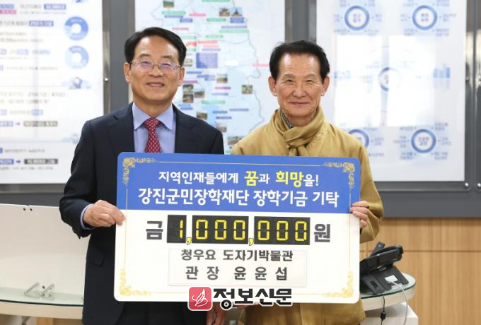 ![]() 강진군, 미래를 밝힐 장학금 기탁 행렬 이어져(윤윤섭 청우요 도자기박물관 관장 1백만 원) |
