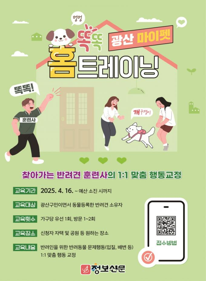 대상자는 광산구에 거주하면서 올바른 돌봄교육이 필요한 반려견 가정이며, 유선 상담과 함께 가구당 1∼2회씩 총 100회의 행동 교정 교육이 진행된다.