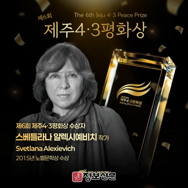 2015년 노벨문학상 수상자인 스베틀라나 알렉시예비치 작가는 「전쟁은 여자의 얼굴을 하지 않았다」등 다수의 저작이 한국어로 번역·출간되어 국내에도 널리 알려져 있다. 기자회견에서는 작가가 문학을 통해 평화와 인권의 가치에 조명해온 활동과 업적을 소개하고, 수상 소감을 통해 제주4·3평화상의 의미를 전할 예정이다.
