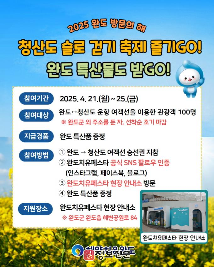 이벤트는 섬 관광 활성화와 특산품 홍보를 위해 마련됐다. 이벤트 참여 대상자는 청산도 여객선 승선권을 소지한 관광객(완도군 외 타 지역에 주소를 둔 자)이며, 4월 21일부터 26일까지 5일간 선착순 100명에게 특산품을 증정할 계획이다.