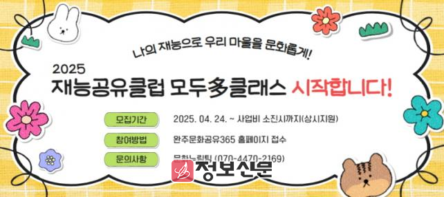 ![]() 완주문화도시지원센터, 재능공유클럽 '모두多클래스' 추진 |