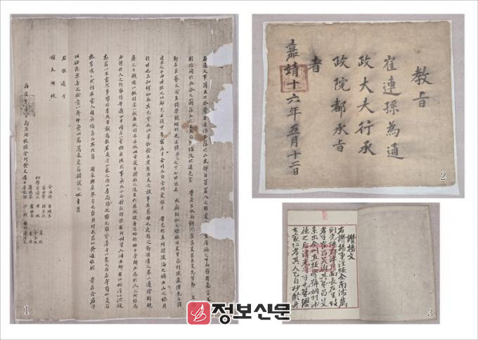 ![]() 1866년 남원의 전주최씨 종중에서 여수면 학동 주민에게 보낸 글, 2. 1537년 암계 최연손의 승정원 도승지 임명장, 3. 1924년 모성공회에서 쌍효자의 사실을 찬양한 기록 |