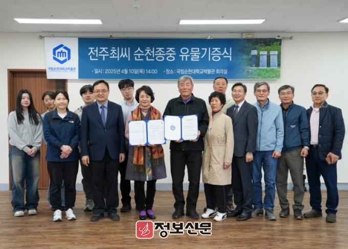 이날 기증식에서는 전주최씨 순천종중에서 대대로 전해오던 고문서(최연손 교지, 병인년 유학 최락 외 14인 통문)와 고서(전주최씨 족보), 민속생활품(5대 동고리, 놋그릇) 등을 기증하였다.