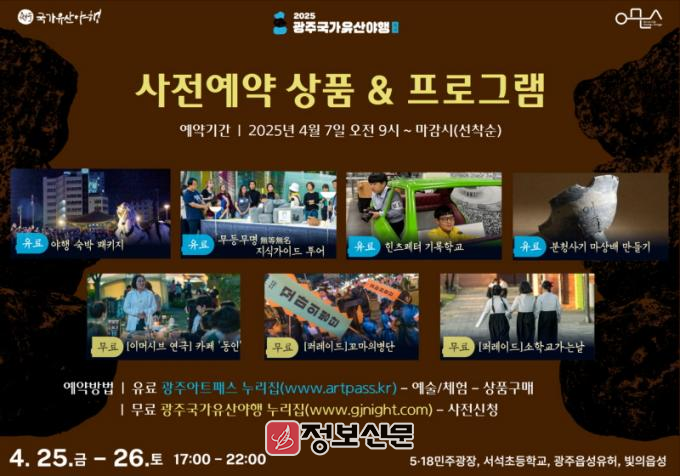 신청은 광주아트패스(www.artpass.kr)와 광주 국가유산 야행 누리집(www.gjnight.com)에서 하면 된다. 기타 자세한 사항은 광주 국가유산 야행 사무국(☎062-608-2409)으로 문의하면 된다.