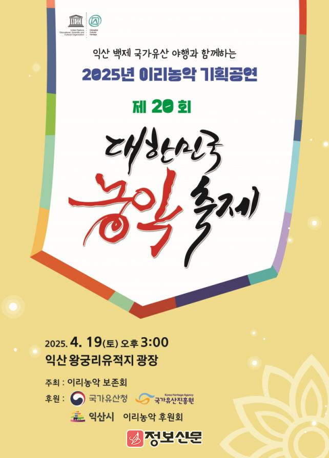 익산시는 농악의 신명과 무형유산의 가치를 담아낸 '제20회 대한민국 농악축제'를 4월 19일 오후 3시 백제왕궁(왕궁리유적)에서 개최한다.