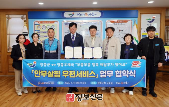 ‘부릉부릉 행복 배달부가 왔어요’란 이름으로 추진하는 이번 사업은 취약계층 가정에 집배원이 생필품을 배달하며 안부살피기를 추진하는 것을 내용으로 한다.협약에 따라 장흥군에서는 사업대상 선정과 생필품 준비 그리고 위기가구 발견 시 복지 상담과 서비스를 연계 하는 역할을 맡기로 했다.