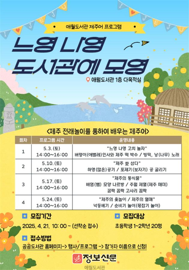 참여를 희망하는 어린이는 4월 21일부터 제주특별자치도 공공도서관 누리집(https://www.jeju.go.kr/lib)⇒행사/프로그램⇒도서관 프로그램 신청을 통해 접수하면 되고, 기타 자세한 사항은 애월도서관(☎064-728-3473)으로 문의하면 된다.