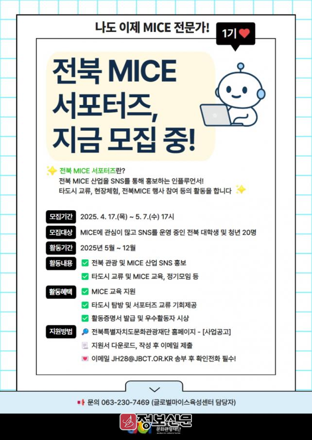 ![]() 전북특별자치도문화관광재단, 2025 전북 청년 마이스 서포터즈1기 참여자 모집 |