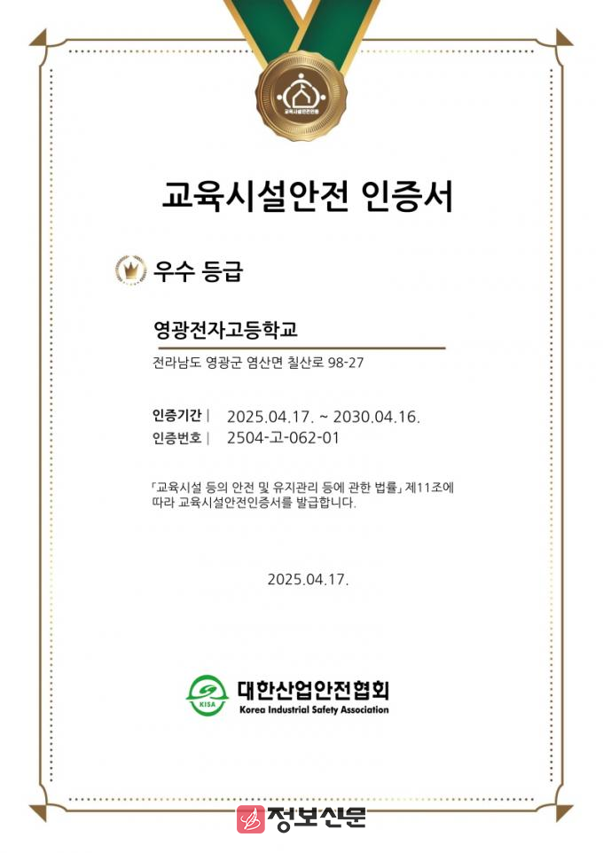 ![]() 영광전자고등학교, 교육시설안전 심사결과 우수등급 취득