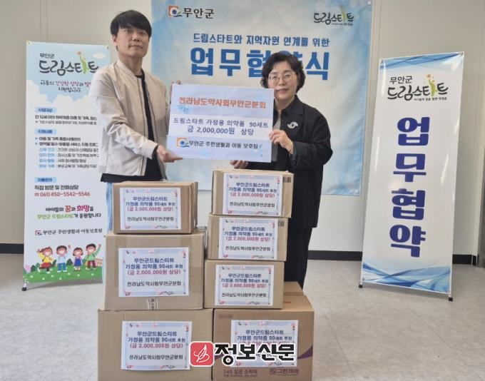 무안군약사회는 200만원 상당의 습윤밴드, 상처치료제, 드레싱스틱, 일회용 밴드, 면봉 등으로 구성된 가정용 응급약품 꾸러미를 기탁했으며, 드림스타트는 5월부터 대상 세대에 전달할 계획이다.