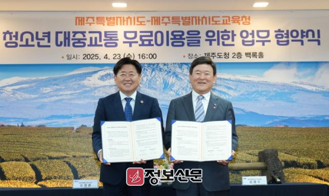 제주도와 제주도교육청은 23일 오후 4시 제주도청 백록홀에서 ‘따뜻하고 행복한 교통·교육복지’ 실현을 위한 청소년 대중교통 무료이용 업무협약을 체결했다.