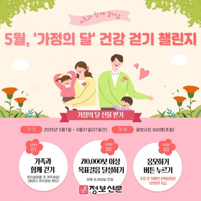 ![]() 광양시, 워크온 ‘5월, 가정의달 건강 걷기 챌린지’ 운영 |