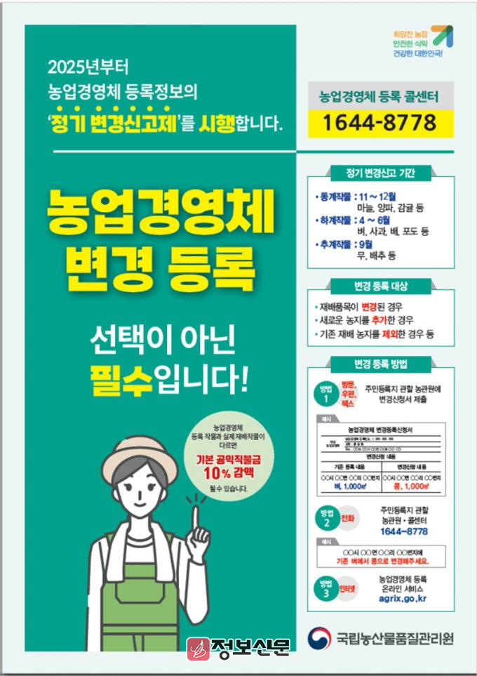 이는 정확한 농업경영체 등록정보를 토대로 맞춤형 정책지원을 추진하고 농산물 수급 등 정책 기초자료로 활용하는 등 농정 발전의 선순환 구조를 만들기 위한 방안이다. 하지만 바쁜 영농활동과 의무에 대한 인식 부족 등으로 농업인이 제때 변경등록을 하지 않고 있어 지원 사업에서 배제되는 등의 불이익을 받을 우려가 있다.