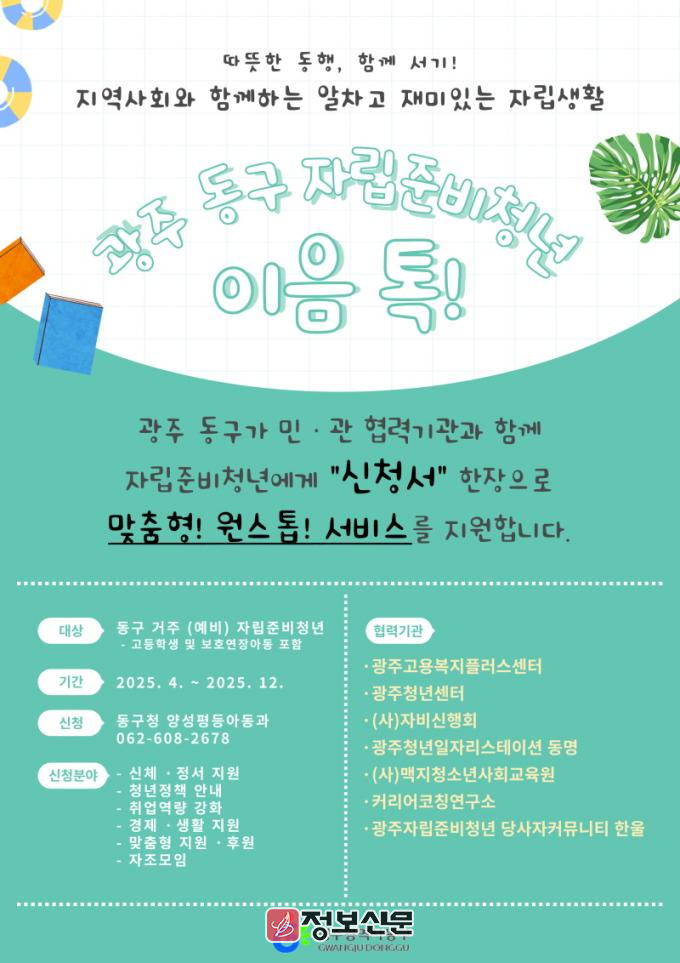 동구는 자립준비청년의 성공적인 자립 지원을 위해 지난 2월 광주광역시 고용복지플러스센터, 광주청년센터, (사)자비신행회, (사)맥지청소년사회교육원, 커리어코칭연구소, 광주자립준비청년 당사자커뮤니티 한울 등 총 7개 민관 기관과 업무협약을 체결했다.