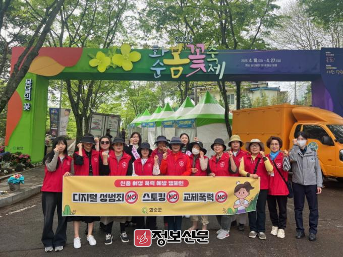 화순군 · 화순경찰서 · 여성일상지킴이 · 어울림가정폭력상담센터 · 여성친화도시군민참여단과 함께한 이번 캠페인은 최근 사회적 문제로 대두되고 있는 신종 여성 폭력인 디지털 성범죄·스토킹·교제폭력의 심각성 전파 및 예방을 위한 홍보활동을 위해 마련됐다.
