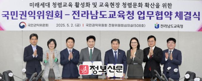 양 기관은 5월 2일 국민권익위 세종청사에서‘미래세대 청렴교육 및 청렴 문화 확산을 위한 업무협약(MOU)’을 체결하고, 청렴교육 관련 제도 개선과 실천 방안 공동 추진에 합의했다.