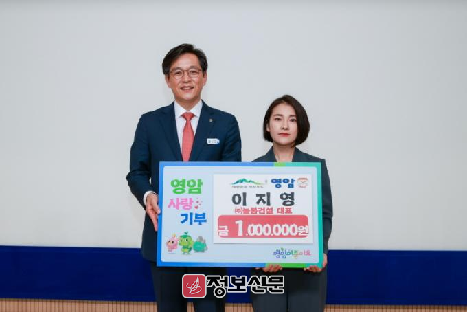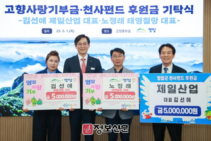 기업의 사회공헌활동 실천과 지역 나눔문화 확산을 위해 영암군을 찾은 기업인은 이지영 늘봄건설 대표, 김선애 제일산업 대표, 노정래 태영철망 대표. 이 대표는 100만원, 김 대표와 노 대표는 각각 500만원의 고향사랑기금을 기부했다.