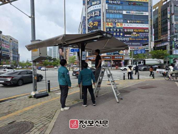 광산구는 조기 가동을 위해 지난 4월 그늘막, 쿨링포그 등 폭염저감시설물 점검·정비를 완료했다.