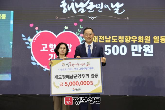 전라남도청에서 근무하는 해남 출신 공직자들로 구성된 재전남도청해남군 향우회에서도 해남군 고향사랑기부제 응원에 십시일반 뜻을 모아 500만원을 기탁했으며, 해남군 출신으로 폐기물 처리 및 자원 재생업체를 운영하는 제주청정로지스(주) 임연식 대표는 고향에 대한 감사의 마음을 담아 200만원을 기탁했다.