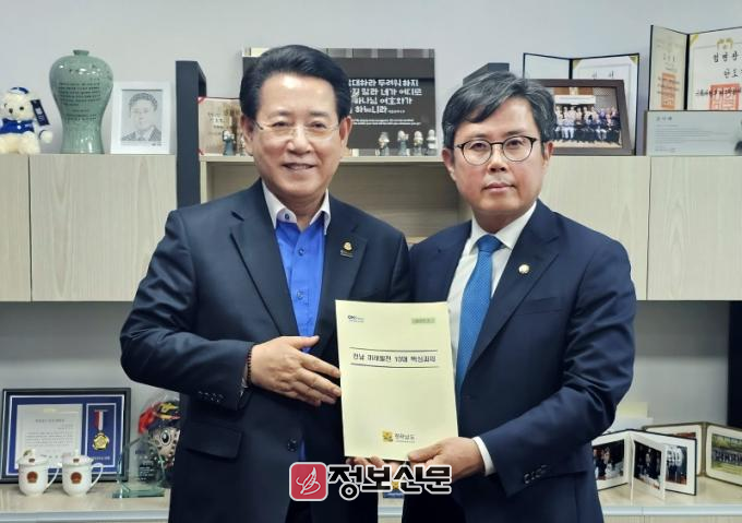 김영록 지사는 이날 ▲‘솔라시도 AI 에너지 신도시’ 조성 ▲나주 ‘에너지 AI 모델시티’ 조성 ▲‘석유화학·철강산업’ 대전환 메가 프로젝트 추진 ▲‘AI 첨단 농·축산업 융복합 지구’ 조성 ▲우주발사체 특구 내 ‘제2우주센터’ 조성 ▲무안국제공항, ‘동북아 대표 관문공항’ 육성 등 전남도가 지역 미래발전을 위해 최우선적으로 대선공약에 반영시킬 10대 핵심과제를 설명하고, 정당 공약에 채택되도록 협조를 구했다.