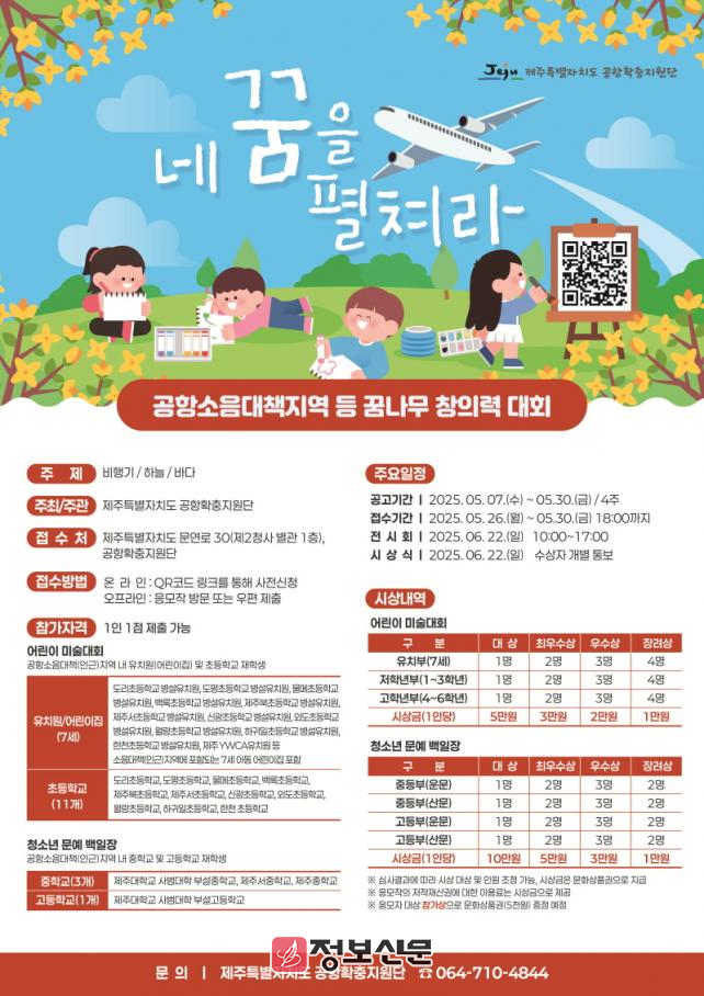 제주특별자치도가 공항소음대책지역 어린이와 청소년들의 창의력 증진은 위한 ‘네 꿈을 펼쳐라’ 공모전을 5월 30일까지 개최한다.