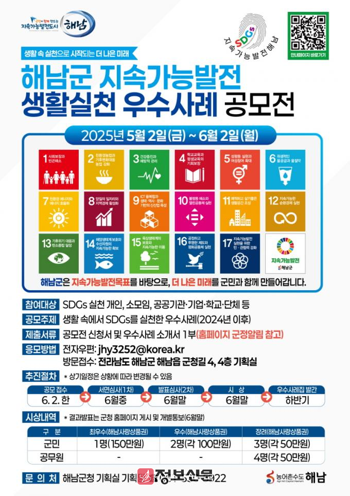 해남군 관계자는“지속가능발전은 군민 한 사람, 한 사람의 자발적인 실천에서 출발한다”며“이번 공모전을 통해 우리 생활 속에서 자연스럽게 실천되고 있는 다양한 사례들이 발굴·공유됨으로써 해남의 지속가능한 미래를 함께 만들어가는 계기가 되기를 기대한다”고 전했다.