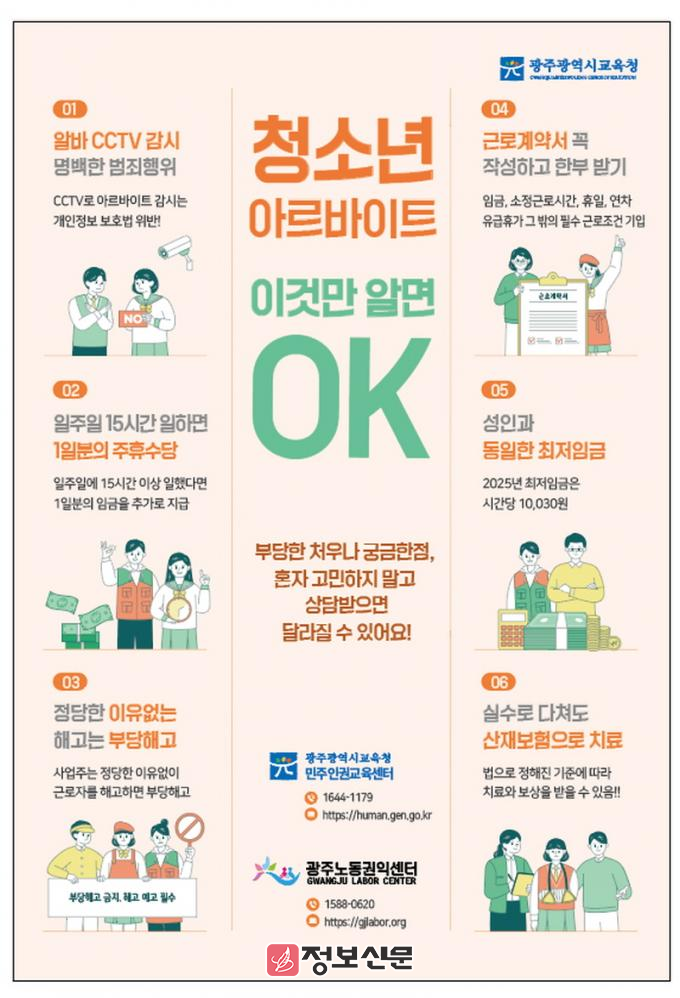 특히 포스터 하단에 시교육청 민주인권센터, 광주노동권익센터 상담원 연락처도 포함돼, 노동인권 침해 사례 발생 시 즉각적이고 실제적인 도움을 받을 수 있도록 구성됐다.
