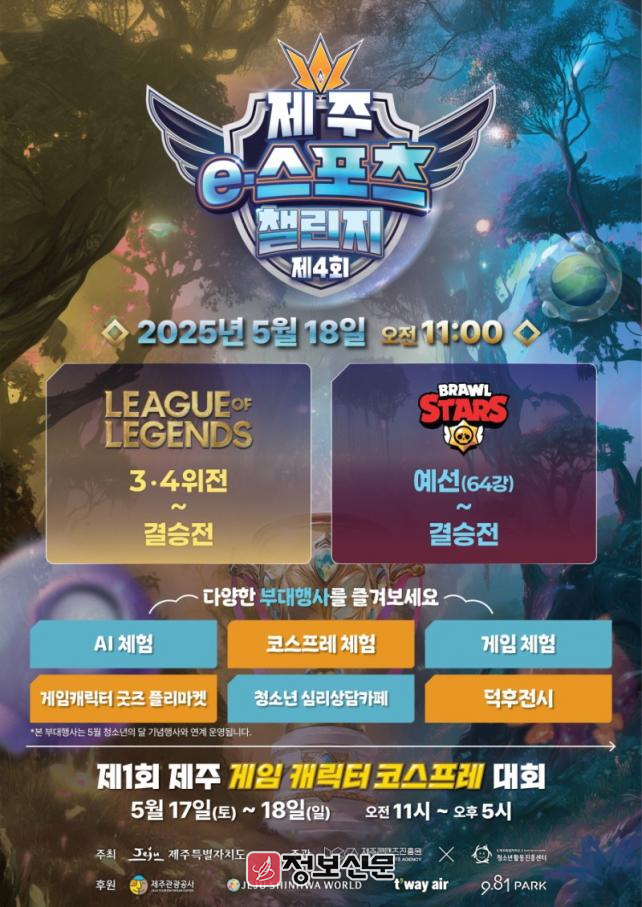 <제4회 제주 e-스포츠 챌린지 대회> 본선은 18일 11시부터 시작된다. 대회 종목으로는 <리그오브레전드> 일반·청소년 부문 3·4위전과 결승전이 진행되며, <브롤스타즈>의 예선과 결승이 동시에 진행되어 게임 매니아들의 관심이 높아지고 있다.