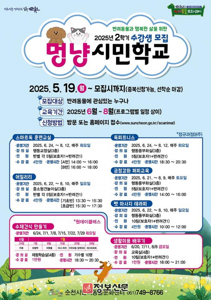 ![]() 순천시 반려동물문화센터, ‘멍냥시민학교’ 2학기 수강생 모집 |