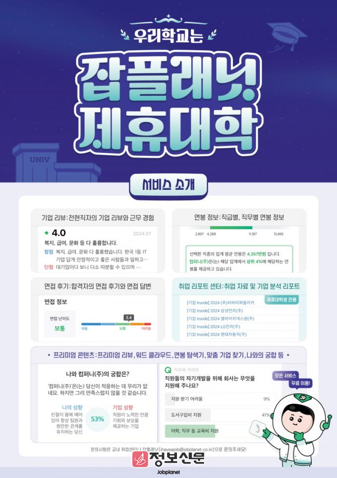 조선대는 이번 제휴 서비스를 통해 취업을 준비 중인 학생들에게 온라인 기반의 취업 지원 콘텐츠를 무료로 제공할 계획이다. 서비스 이용을 원하는 재학생은 학교 웹메일 계정으로 회원가입 및 인증 절차를 거쳐 잡플래닛 제휴대학 서비스를 무제한으로 이용할 수 있다.