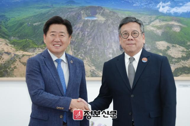 오영훈 지사는 14일 2025 아시아태평양경제협력체(APEC) 통상장관회의 참석차 제주를 방문한 알제논 야우(Algernon Yau) 홍콩 상무경제발전부 장관을 도청 집무실에서 만나 양 지역 간 협력 강화방안을 논의했다.