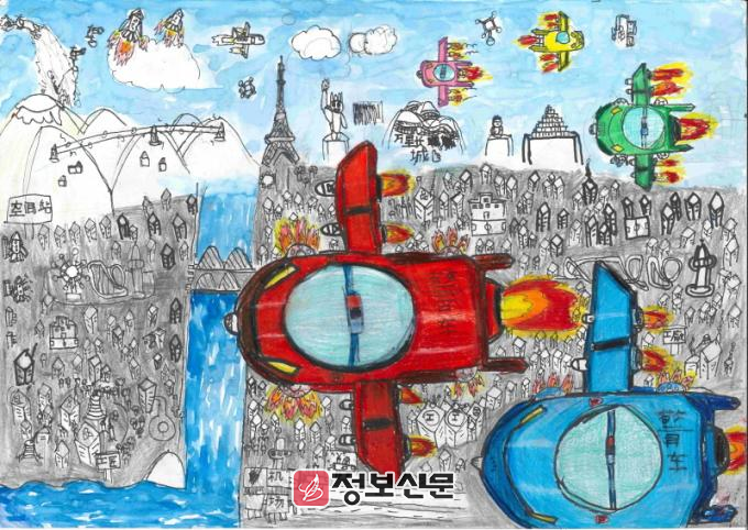 순천 청소년 가운데 성동초등학교 5학년에 재학 중인 편○우 학생은 ‘하늘을 나는 경찰차’를 주제로 한 작품으로 1등상을 수상했다. 이 작품은 최첨단 기술을 접목한 경찰차로 치안을 신속히 해결하는 미래를 그려, 기술 발전의 긍정적 변화를 창의적으로 표현했다.