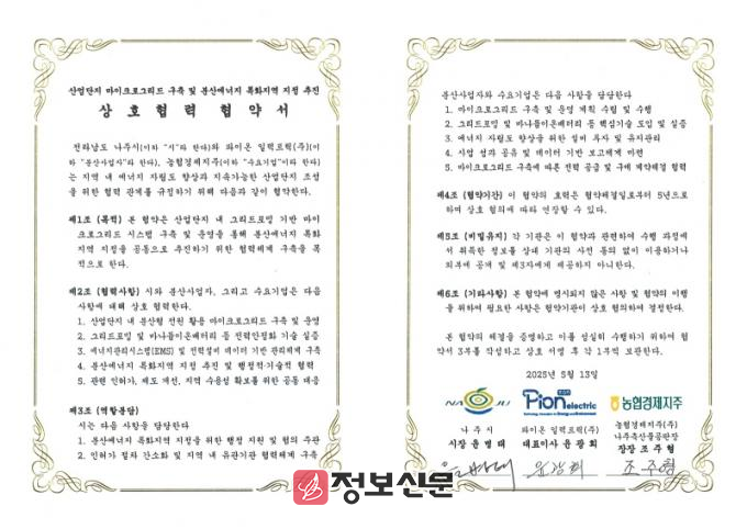 ![]() 산업단지 마이크로그리드 구축 및 분산에너지 특화지역 지정 추진 상호협력 협약서. (사진제공-나주시)