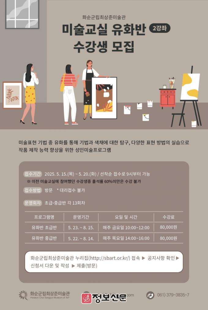 ![]() 화순군립최상준미술관, 미술교실 유화반 2강좌 수강생 모집 |