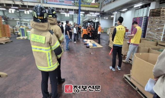 이번 훈련은 실제 화재 발생 상황을 가정해 초기 대응, 대피로 확보, 부상자 이송, 응급환자 발생 시 심폐소생술 등 전 과정을 체계적으로 진행한 실전형 훈련으로, 도매시장 소속 법인 및 공판장 관계자와 순천소방서, 유통종사자들이 참여했다.