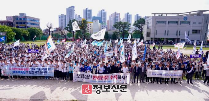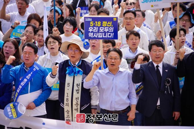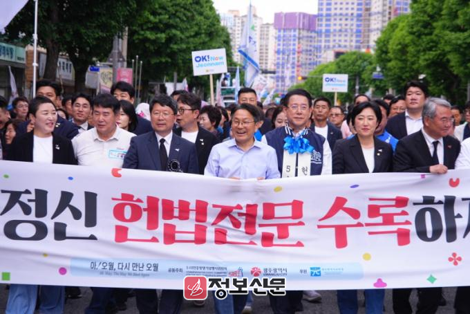민주평화대행진에는 강기정 광주시장과 우원식 국회의장을 비롯해 신수정 광주시의회의장, 이정선 광주시교육감, 김영록 전남도지사, 오영훈 제주특별자치도지사, 광주시 자치구 청장, 국회의원, 5월 공법단체회장, 대학생, 시민 등 1만5000여명이 참가했다.
