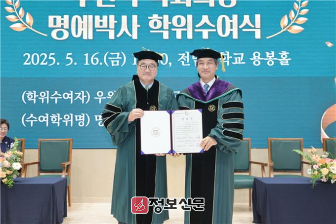 ![]() 지난 16일 전남대학교 용봉홀에서 열린 ‘우원식 국회의장 명예박사 학위수여식’에서 우원식 국회의장(왼쪽)과 이근배 총장이 기념사진을 찍고 있다. (사진제공:전남대학교 제공) |