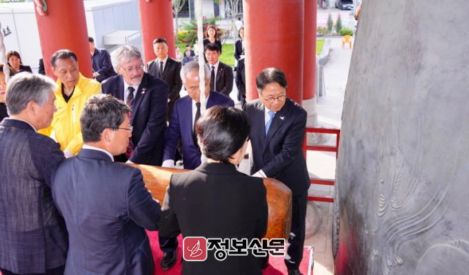 또, 5‧18 당시 시민군으로 활동하며 윤상원 열사의 기자회견을 통역한 데이비드 리 돌린저 광주명예시민(한국명 임대운), 5‧18 당시 여성 시민군으로 활동한 임영희 씨, 광주인권상 수상자인 갈루 수자트모코 ‘아시아 정의와 권리’ 상임이사 등도 함께 타종에 참여해 연대의 의미를 나눴다.