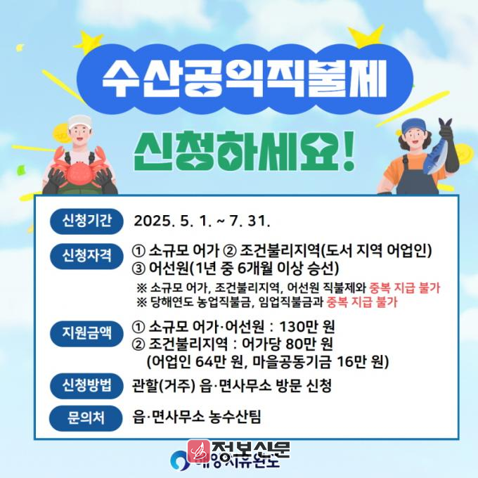 수산공익직불제는 수산업·어촌의 공익 기능 증진과 어업인의 소득 안정을 도모하기 위한 제도로 ▲소규모 어가 직불제 ▲조건불리지역 직불제 2종이 있다. 소규모 어가 직불제는 어업 경영 규모가 영세한 어업인을 대상으로 어가당 130만 원을 지급한다.