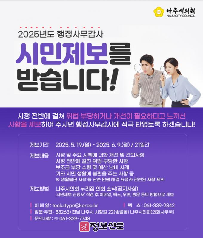 ![]() 나주시의회, 2025년 행정사무감사 앞두고 시민 제보 접수 |