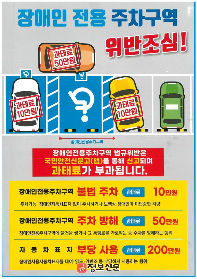 한편, 영광군 관계자는 “사소한 부주의나 실수로 인해 과태료가 부과되는 일이 없도록 잘 지켜주길 바라며 군에서도 장애인전용주차구역의 올바른 이용과 홍보에 최선을 다하겠다”고 말했다.