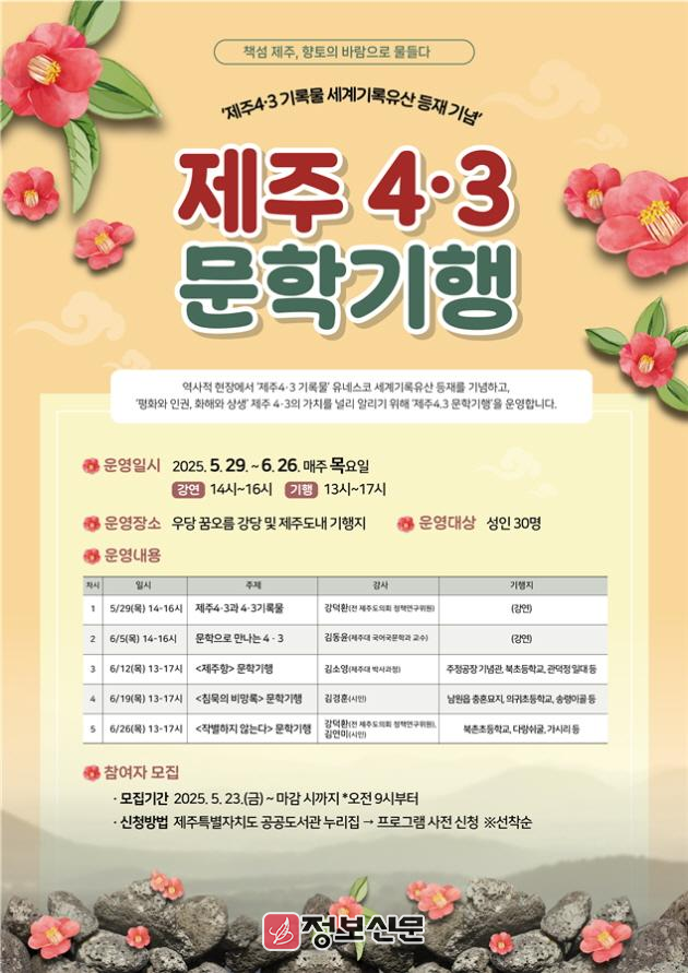 또한, 문학기행과 연계하여 우당도서관 향토자료실 내‘진실을 밝히다-제주 4·3 기록물’을 주제로 4·3 기록물 등재 추진 과정과 등재의미를 알리기 위해 수형인 명부, 형무소에서 보낸 엽서 사진, 채록증언, 진상규명 관련 도서 전시 등 특별전시도 열린다.